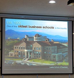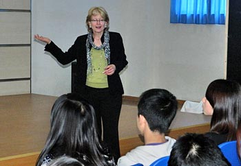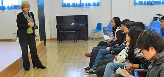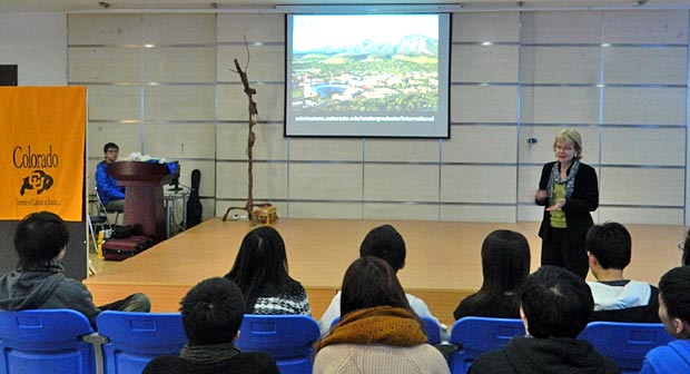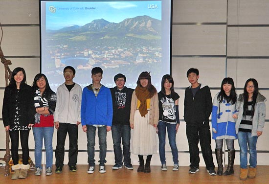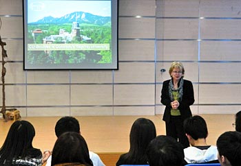 2012年3月14日周三,美國科羅拉多大學(xué)國際學(xué)生招生辦副主任Jeannine Bell女士來訪我校國際項(xiàng)目部。Bell女士為國際項(xiàng)目部高中學(xué)生做了一場(chǎng)精彩的演講。她向同學(xué)們介紹了科羅拉多大學(xué)的校園文化以及大學(xué)申請(qǐng)流程。同學(xué)們踴躍發(fā)言,積極提問。通過Bell女士的講解,同學(xué)們對(duì)科羅拉多大學(xué)的認(rèn)識(shí)更深了。