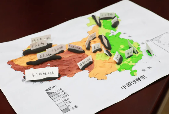 同學(xué)們需準確繪制中國輪廓,用不同顏色黏土呈現(xiàn)三級階梯分布,標注階梯界線、主要山脈和地形區(qū)。從青藏高原至長江中下游平原,地勢變化在模型中清晰展現(xiàn)。