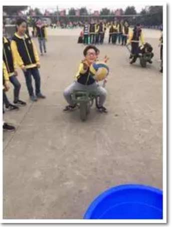 坐在雞公車?yán)锿痘@,你沒見過吧?嘿,這可比真正的投籃難多了,瞧,投籃高手也有失誤的時候啊!