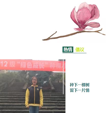 “種下一棵樹,留下一片情!人人都出一份力,每班種下一棵玉蘭樹,為母校增添一抹綠色!我們種下綠色的樹苗,播撒春的氣息,用愛的陽光,使綠樹常青吧!相信在我們共同努力下,我們的校園將更美麗……!”