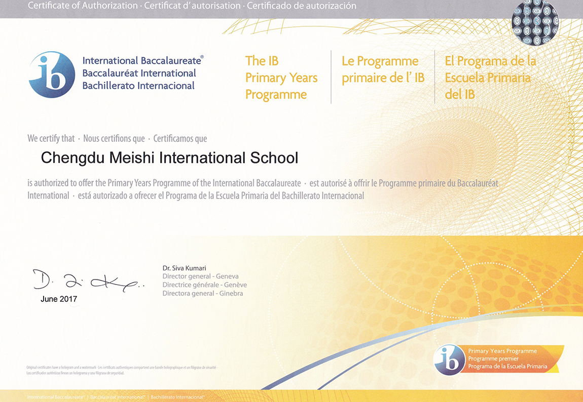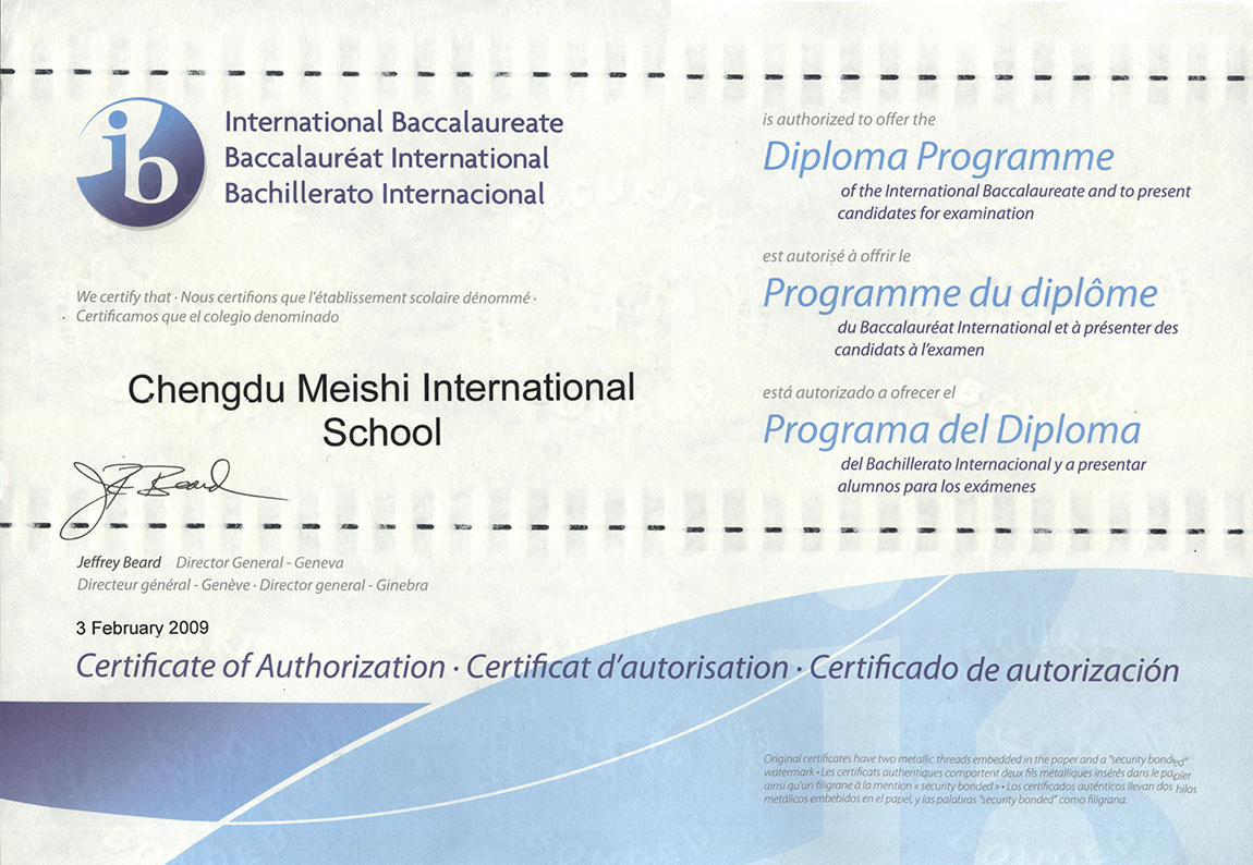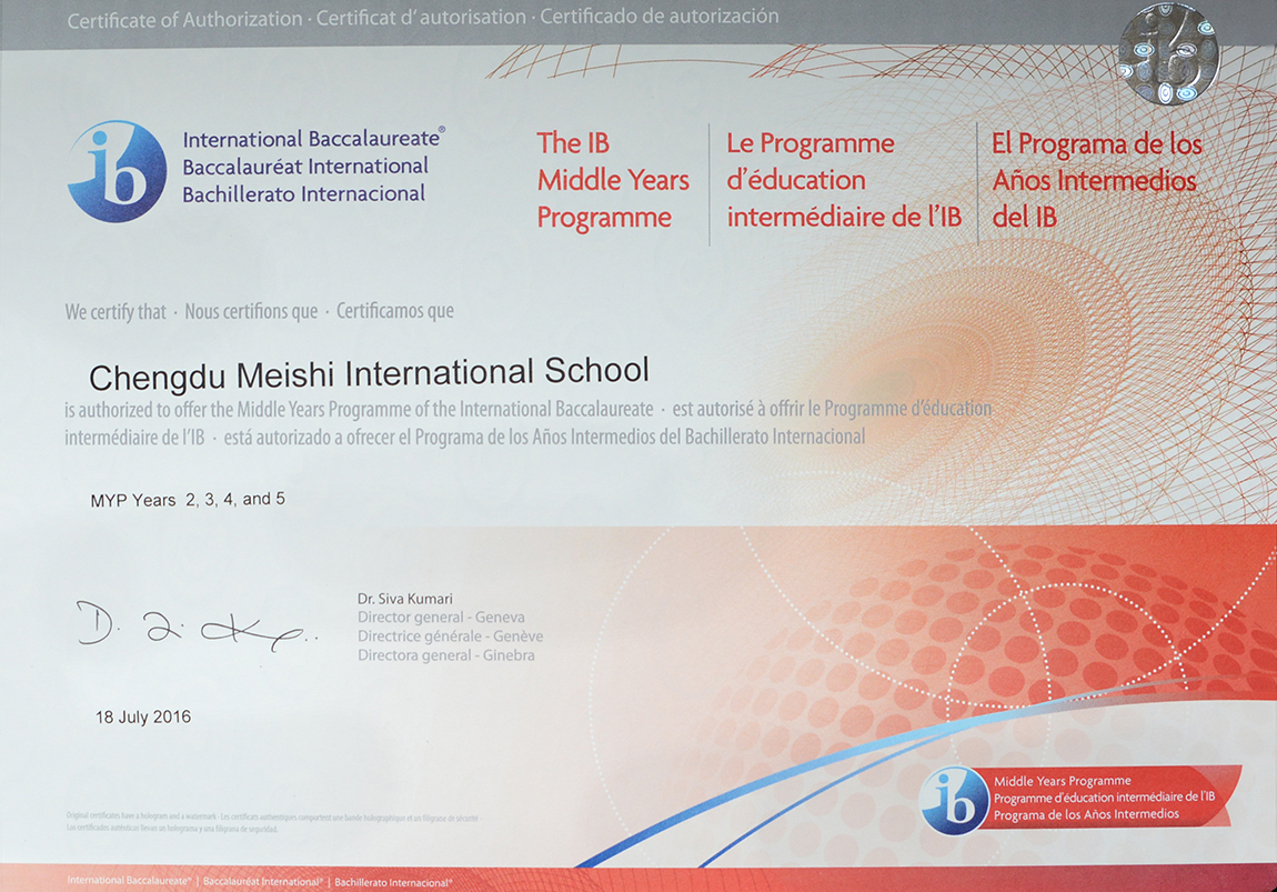 成都美視師一學(xué)校經(jīng)IB授權(quán),引進(jìn)DP(有文憑)課程;獲DP和MYP、PYP授權(quán),開(kāi)設(shè)DP、MYP、PYP項(xiàng)目,美視師一是中國(guó)西南地區(qū)首家同時(shí)實(shí)施IB三大項(xiàng)目的國(guó)際學(xué)校。