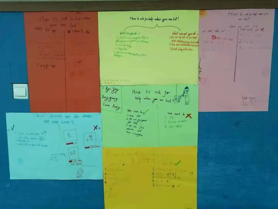 以教材為主線,結(jié)合學(xué)情整合學(xué)習(xí)資源;在主題引領(lǐng)下,關(guān)注貼近兒童生活的話題并進(jìn)行延伸;以心理小游戲作為熱身環(huán)節(jié),關(guān)注心理健康,擴(kuò)展認(rèn)知,拓展思維。本課以閱讀寫作課型讓學(xué)生學(xué)習(xí)走丟以后如何求助,小組合作制作海報(bào)告訴他人如何求助,最后提高防范意識(shí),預(yù)防不被走丟。從學(xué)會(huì)“求助”到“助人”最后升華到“自助”緊扣主題,培養(yǎng)學(xué)生英語閱讀素養(yǎng),掌握閱讀策略,提取信息以及解決問題的能力。