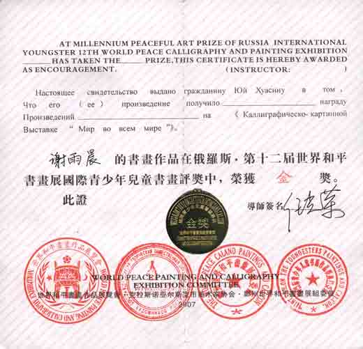 謝雨晨同學(xué)在俄羅斯第十二屆世界和平書(shū)畫(huà)展國(guó)際青少年兒童書(shū)畫(huà)評(píng)獎(jiǎng)中榮獲金獎(jiǎng)