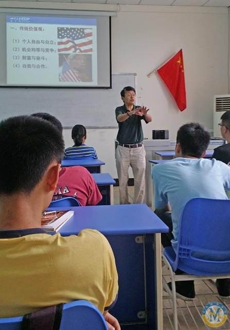 2014年7月15日上午10點(diǎn)50分,四川大學(xué)歷史文化學(xué)院的周教授受邀來訪中美英才班。本月中美英才班的高二同學(xué)們正在上暑期課程,UEI的總裁Dan Plaut和總監(jiān)Misha Cao為了豐富同學(xué)們的課程內(nèi)容,在炎炎夏日增添一些樂趣,特意邀請了四川大學(xué)的周教授為大家?guī)硪粓鲆?ldquo;中美文化對比”為主題的實用又幽默的演講。周教授以其豐富的海外人生閱歷、充實的演講內(nèi)容、生動幽默的演講方式贏得在座師生的陣陣掌聲與笑聲,最重要的是拓寬、刷新了同學(xué)們對美國社會、美國文化的認(rèn)知。演講結(jié)束時,整個教室爆發(fā)出熱烈而持久的掌聲,表達(dá)了對周教授的演講的喜愛和謝意。