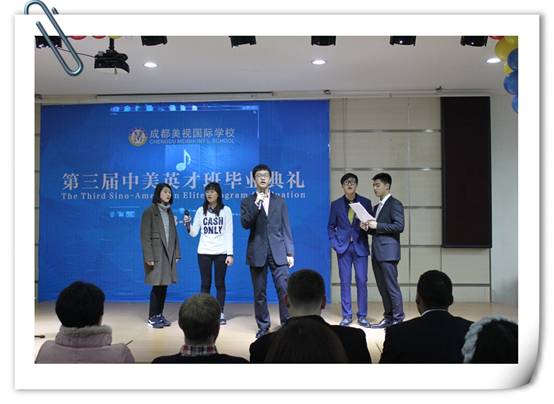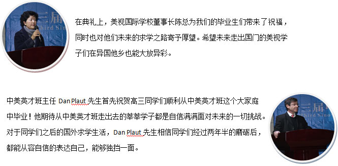 2016年1月19日,在國際部禮堂舉行了第三屆中美英才班畢業(yè)典禮,大家在此齊聚,共同為即將告別高中時代的畢業(yè)生們送上最真摯的祝福。 別離,是有點(diǎn)難舍,但不是悵然;   是有點(diǎn)遺憾,但不是悲觀,因?yàn)槲覀冇邢喾甑南M诎参?,因?yàn)槲覀冎离x別是為了更好的相遇,為了遇見更好的自己。