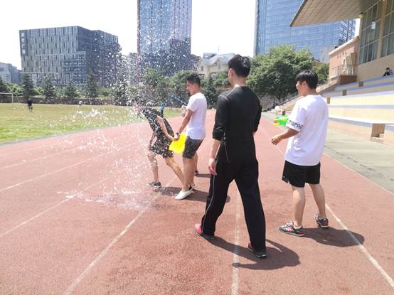 同學(xué)們被分為兩隊,大家對立而坐,各隊均有一名投手,負(fù)責(zé)向?qū)Ψ酵稊S水球。隨著兩隊賽事的結(jié)束,毫不知情且毫無察覺的同學(xué)們遭受了來自外教的“突襲”,外教們從角落里一涌而出,舉著水槍向同學(xué)們奔來,四散逃走的同學(xué)們在反應(yīng)過來之后,發(fā)起了“反攻”,歡聲笑語傳遍每個角落。