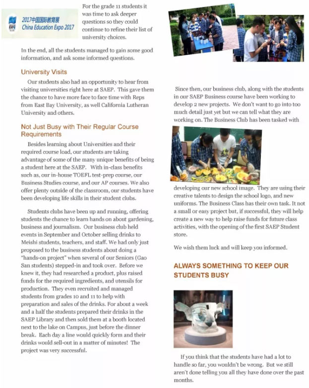 園藝、商務(wù)和新聞學(xué)生社團的開展,使同學(xué)們有機會提升自我動手能力。9月和10月,我們商務(wù)社團的同學(xué)們在校內(nèi)向同學(xué)、老師們售賣自制飲料。我們只是建議商務(wù)社團的同學(xué)們做一個親身動手實踐的項目。在我們知道這個項目之前,他們已決定要做何種產(chǎn)品,還為產(chǎn)品所需的原料和機器籌集了資金,甚至還請高一和高二的同學(xué)幫助他們準(zhǔn)備和售賣飲料。大約一個多星期的時間,同學(xué)們準(zhǔn)備飲料,然后在晚飯休息時間售賣。每天的售賣場面火爆,并且飲料在幾分鐘內(nèi)就售賣一空。此次實踐項目運作非常成功!從那之后,商務(wù)社團和商務(wù)課程的同學(xué)們一直在開發(fā)兩個新項目。商務(wù)社團負(fù)責(zé)設(shè)計學(xué)校標(biāo)志和校服。商務(wù)課程的同學(xué)們也在準(zhǔn)備自己的項目——創(chuàng)辦第一家中美英才班學(xué)生商店。如果項目運作成功,那么他們將創(chuàng)建一條為未來班級活動籌集資金的新渠道。希望同學(xué)們的項目能夠順利開展,讓我們拭目以待!