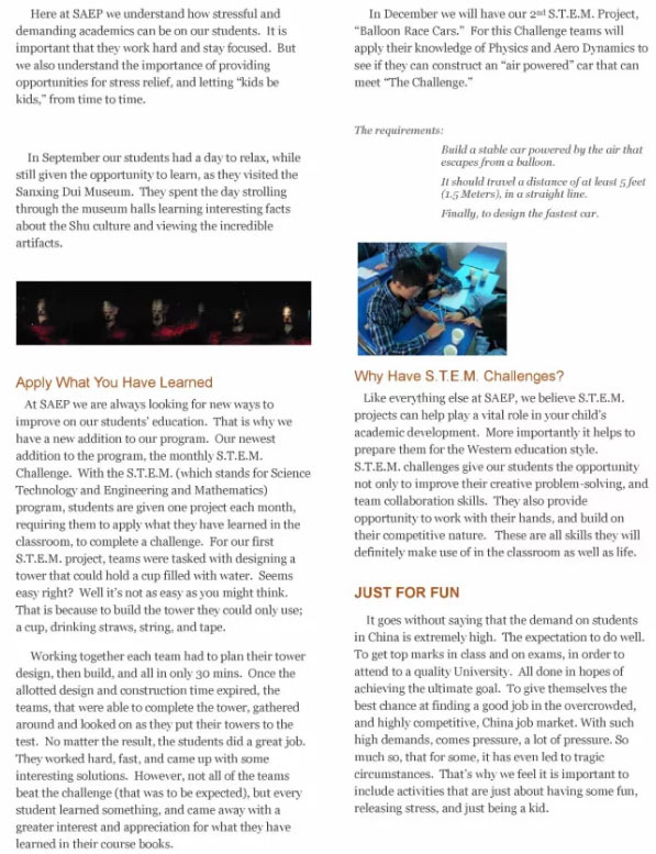 中美英才班一直在尋求提高學(xué)生教育的新方法。 因而我們開設(shè)了一個新的項目——每月一次的S.T.E.M.(科學(xué)、技術(shù)、工程、數(shù)學(xué))挑戰(zhàn)。每月給同學(xué)們安排一個項目,要求運用他們在課堂上所學(xué)到的知識完成挑戰(zhàn)。第一個參加S.T.E.M.項目團隊的任務(wù)是設(shè)計一個可以放置盛滿水的杯子的塔。聽起來似乎很簡單,其實不然,因為他們制作塔的材料只有一個杯子、吸管、線和膠帶。