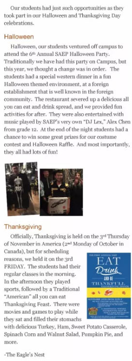 為了將來能夠讓孩子進入一所優(yōu)秀的大學(xué)學(xué)習(xí)以及在未來的求職競爭中勝出,找到一份好工作,中國學(xué)生常常被賦有極高的期望,家長們總是希望他們能夠在學(xué)業(yè)上獲得優(yōu)異成績。在這樣的壓力下,我們認(rèn)為讓同學(xué)們在活動中尋找樂趣,釋放壓力是非常重要的。因而我們特意為同學(xué)們策劃了萬圣節(jié)和感恩節(jié)的慶?;顒?。