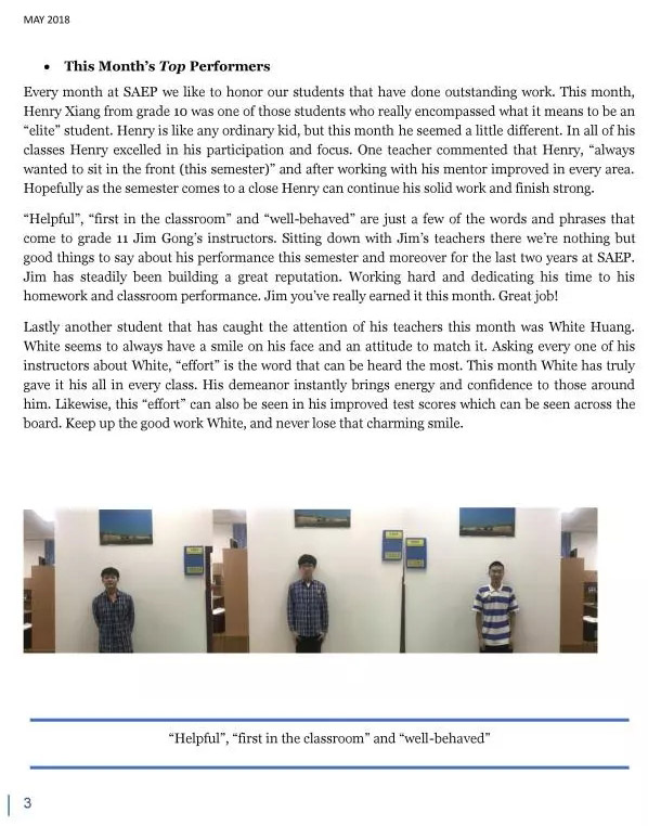 每月,我們都會評選出中美英才班優(yōu)秀學(xué)生。因在課堂出勤以及在上課態(tài)度方面表現(xiàn)優(yōu)異,來自高一的Henry Xiang同學(xué)被評為本月優(yōu)秀學(xué)生。一位老師給予Henry這樣的評價,“總是坐在前排的學(xué)生”。此外,Henry通過參與一對一同伴輔導(dǎo)計劃,在多個領(lǐng)域都獲得了提升。希望Henry繼續(xù)努力保持!