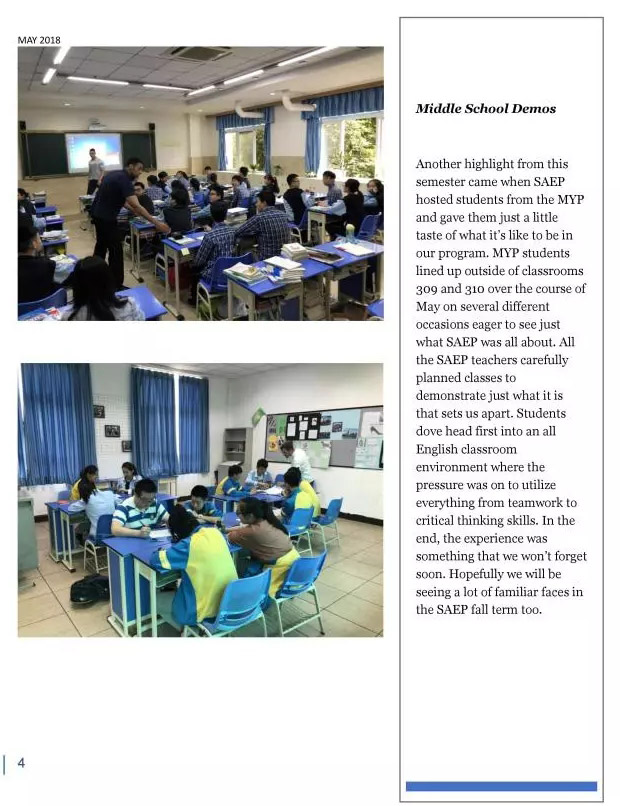 本學(xué)期,中美英才班老師為MYP學(xué)生上了一堂生動的展示課,旨在讓同學(xué)們了解中美英才班的課堂是怎樣的。老師們精心設(shè)計課程,以展示中美英才班的與眾不同。同學(xué)們沉浸在全英文的課堂環(huán)境中,從團隊合作到批判性思維能力,所有這些都給同學(xué)們帶來不小壓力。相信這對同學(xué)們也是一次難忘的經(jīng)歷。希望秋季學(xué)期,能在中美英才班再次見到這些熟悉的面孔。