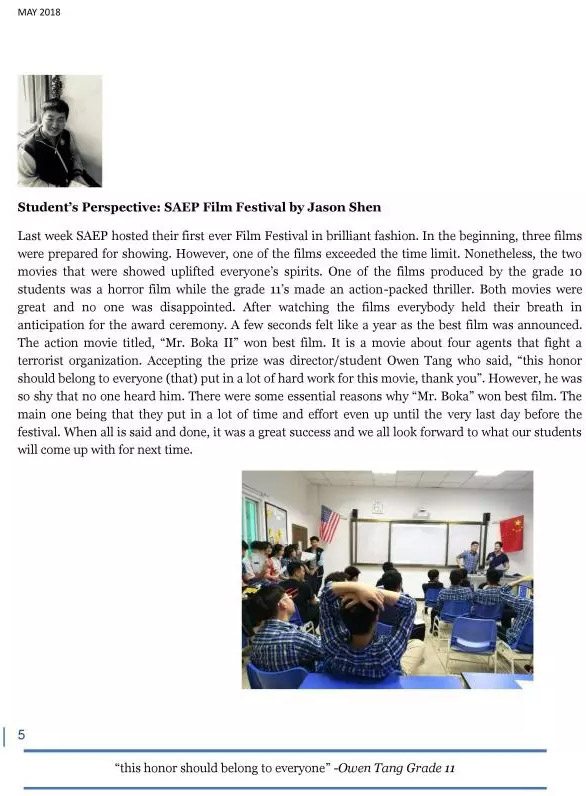 今年中美英才班第一屆電影節(jié)順利舉行。 電影節(jié)上,同學(xué)們共同觀看了歷時兩個月親自制作出的充滿創(chuàng)意的電影,他們自導(dǎo)自演、編寫劇本,為籌備電影拍攝投入了許多精力,尤其是高一和高二的同學(xué)們展現(xiàn)了突出的創(chuàng)造力和合作精神。老師們擔(dān)任評委,評選出了優(yōu)秀電影作品。