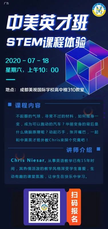 看到這里,或許您想問中美英才班到底是怎樣的項目呢?7月18日,參與中美英才班STEM課程體驗,走進中美英才班日常課堂,與外教Chris一起動手進行模型探究與設(shè)計制作!
